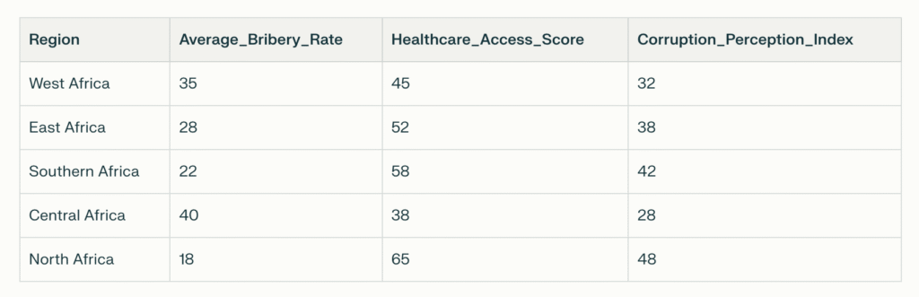 Analysis reveals significant regional variations in corruption patterns. West Africa shows the highest average bribery rates at 35%, followed by Central Africa at 40%, while North Africa records the lowest at 18%. This correlates inversely with healthcare access scores, demonstrating corruption’s direct impact on service delivery.