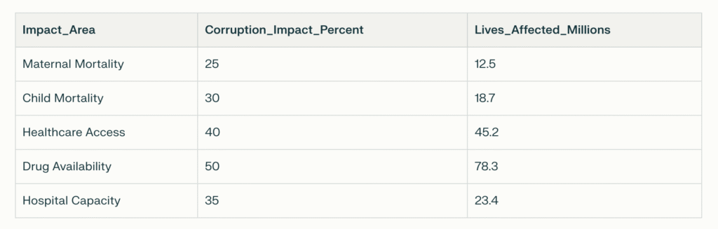 Studies show corruption’s impact affects maternal mortality (25% increase), child mortality (30% increase), healthcare access (40% reduction), drug availability (50% reduction), and hospital capacity (35% reduction).