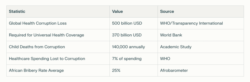 The numbers are staggering. According to World Health Organization estimates, approximately $500 billion in global health spending vanishes annually through corruption—more than enough to achieve universal health coverage worldwide. In Africa, where healthcare systems are already stretched beyond breaking point, this theft amounts to a death sentence for millions.