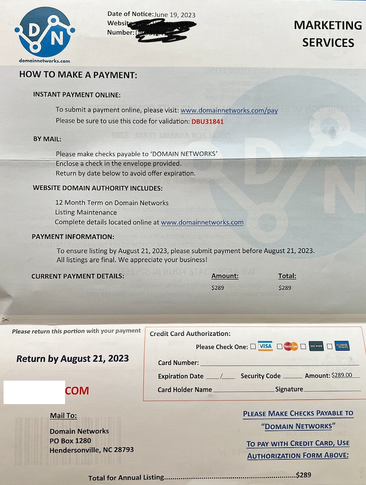 Figure: A deceptive ‘DomainNetworks’ mailer exploiting the term “Domain Authority” to sell bogus SEO listings. This scammer (also known as “US Domain Authority”) targeted unsuspecting businesses.