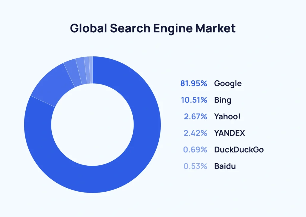 Figure: Global search engine market share (Google 81.95%; Bing 10.51%; Baidu 0.53%; others)